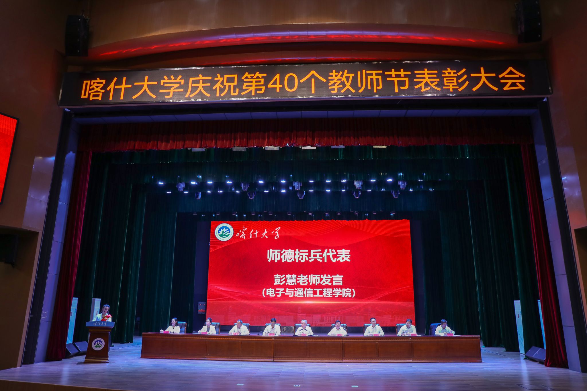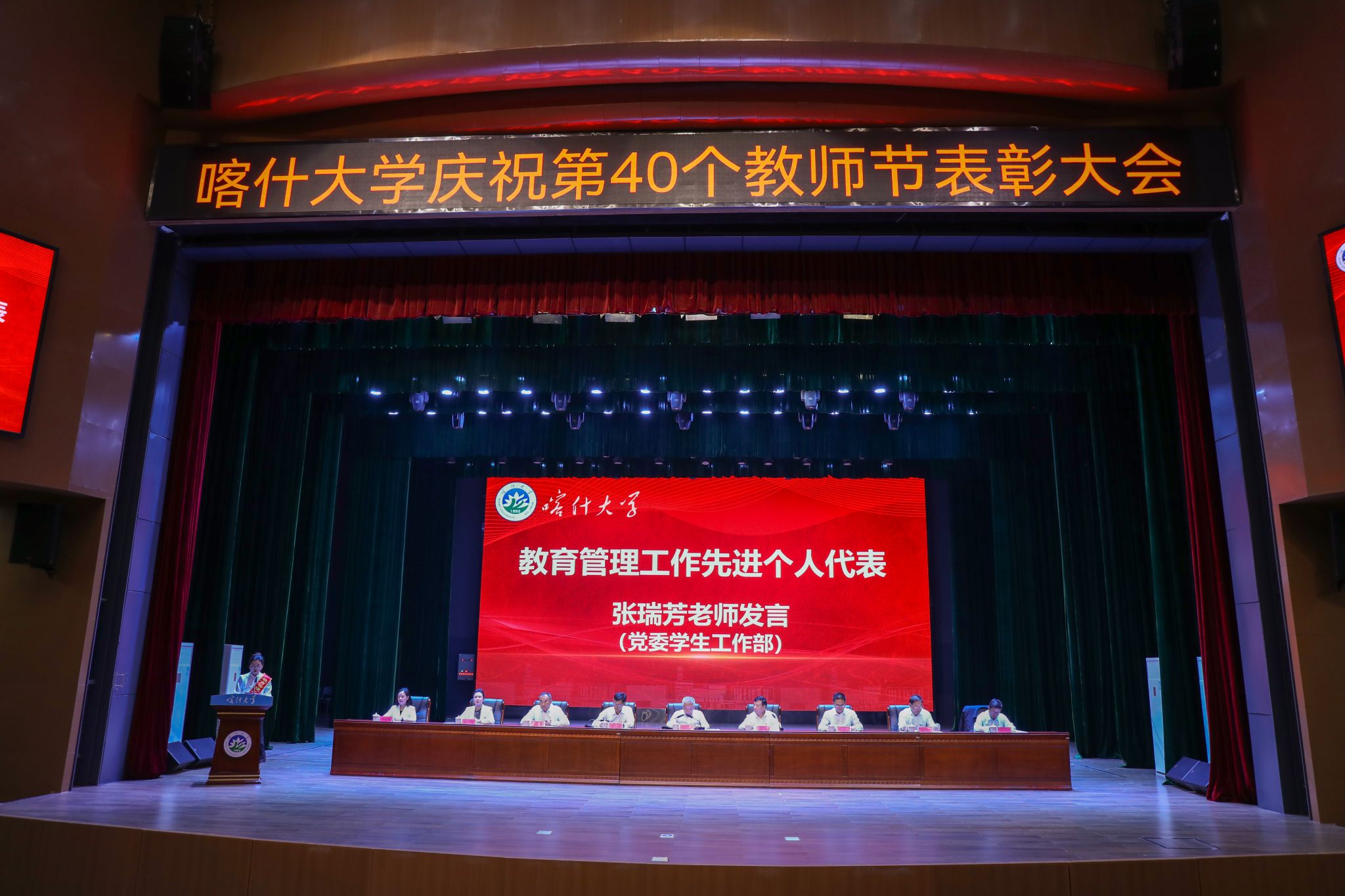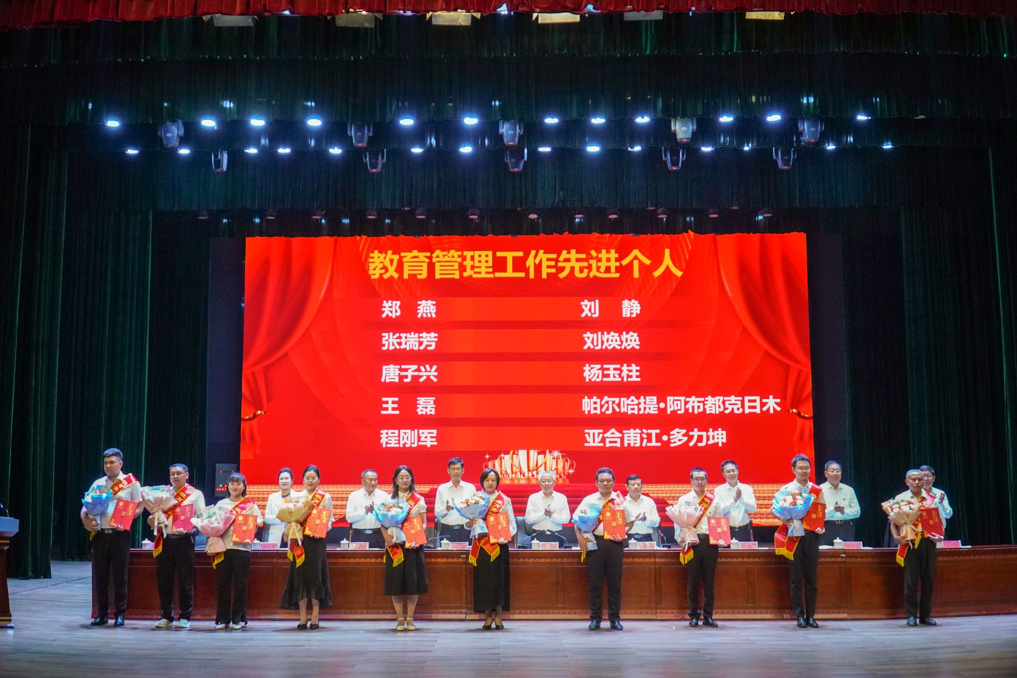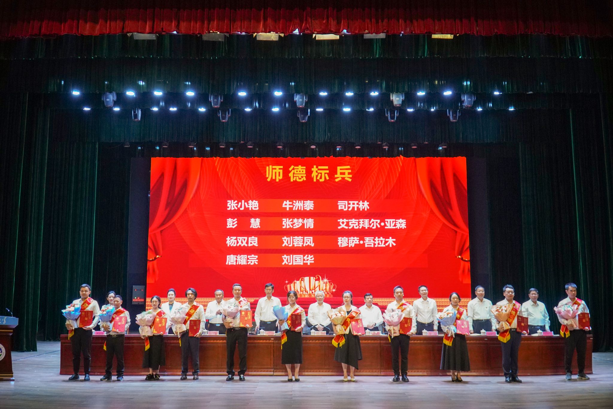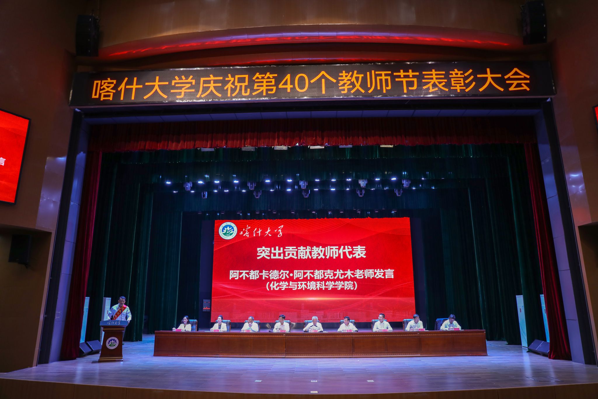 9月10日上午,学校召开教师节表彰大会,校党委书记丁邦文出席会议并讲话,校党委副书记、校长买买提明·木沙主持会议,校党委领导班子成员及全体教师、学生代表在新泉校区新时代会堂欢聚一堂。
