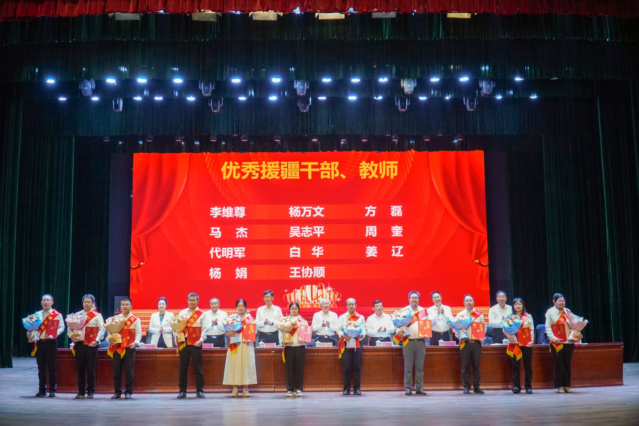 会上,校党委副书记邓勇宣读了《关于表彰2023—2024学年“优秀教师和先进集体”的决定》。与会领导为2023-2024学年度“突出贡献教师”“师德标兵”“教育管理工作先进个人”“优秀银龄教师”“优秀援疆干部、教师”和“师德师风先进集体”颁奖。