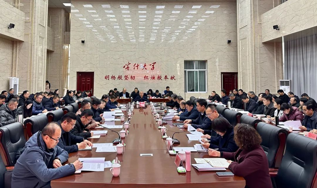 丁邦文强调,2025年是贯彻全国教育大会精神、落实教育强国建设规划纲要的关键之年,是“十四五”收官和“十五五”谋划之年,也是学校发展极其重要、极其关键的一年,我校必须顺势而为、攻坚克难,不遗余力地抓住机遇。要锚定建设成为全国知名、新疆一流、在中亚有重要影响的现代化综合性大学的建设目标,着眼长远、立足当前,做好战略谋划。要抓住教学、科研两条发展主线,明确教学的中心任务,全面提升教学质量;围绕科研能力提升,服务地方经济社会发展。要完成好三个既定任务,全力确保科研目标任务、人才招引任务、学位建设点验收目标按期完成。要把握好“四个基本原则”,坚持更高定位看喀大,坚持从学校的定位谋方向,坚持以问题导向抓工作,坚持从改革中找突破,切实解放思想、转变观念、改变作风。要开好“五个会议”,即学生管理工作会、科研平台建设会、立德树人研讨会、数字赋能研讨会、“十五五”规划研讨会。同时,要落实好立德树人、教学、科研、学科学位点建设、提质扩容、人才建设、学生管理、安全稳定和舆情管理、后勤保障、党的建设等“十个方面工作”的重点工作任务。