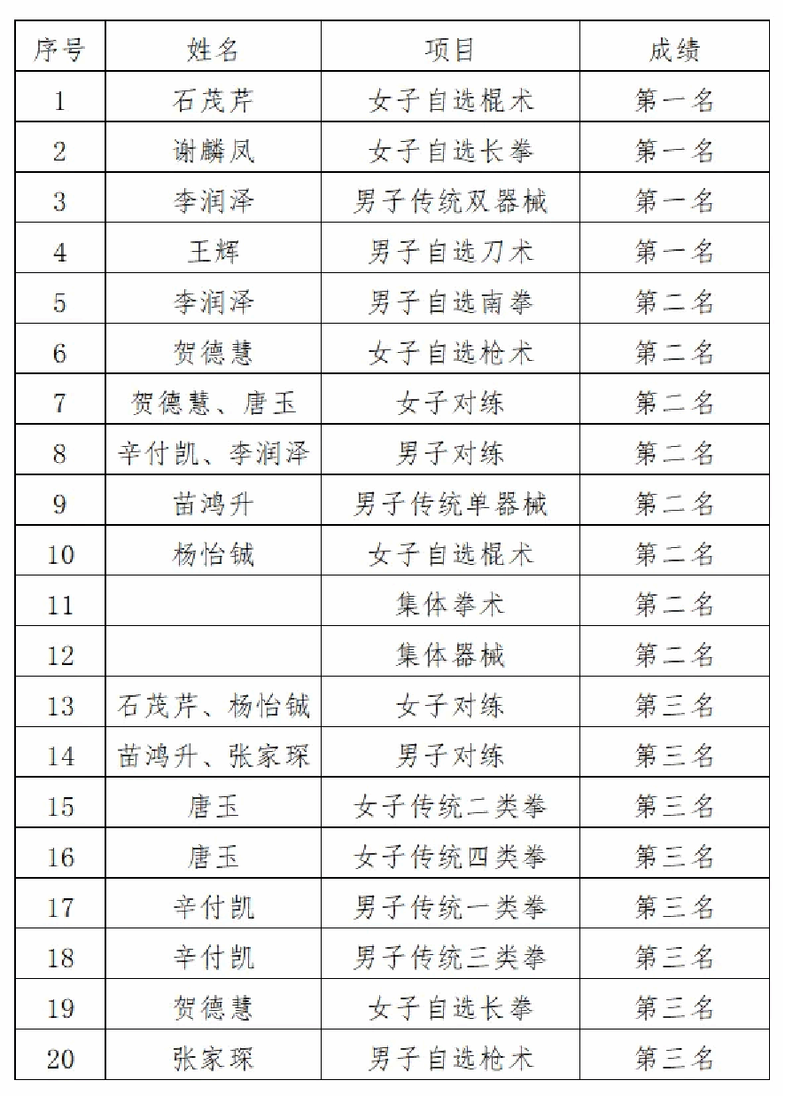 本次大赛设大学生甲组、乙组、丙组和中学生组,涵盖拳术类、短器械类、长器械类及各式太极拳、太极器械、传统拳术和传统器械等60个单人项目,以及集体拳术、集体器械等8个集体项目。大赛吸引了全疆各级各类学校的39支代表队,共计600余人参赛。我校12名武术健儿发挥出色,经过三天的激烈奋战,在众多项目上斩获佳绩。具体成绩如下所示: