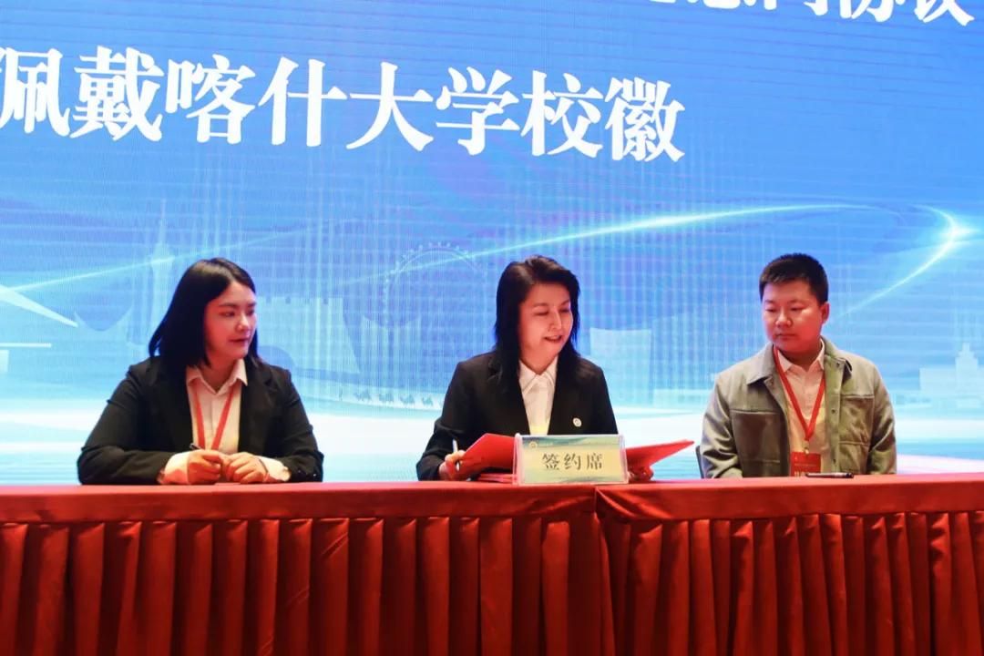帕力旦·吐尔逊与拟引进博士代表签订人才引进意向协议书,并为拟引进博士代表佩戴爱玩棋牌游戏中心校徽。